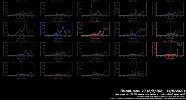 (Clicar numa imagem e usar as teclas das setas para mudar de imagem) Fonte: ECDC - European Centre for Disease Prevention and Control ( https://www.ecdc.europa.eu/en/covid-19/country-overviews ) Incidência (novos casos por 100 mil habitantes acumulados em 14 dias) na União Europeia: Variação de incidência: Evolução em alguns países da Europa (regiões NUTS) Gráficos mais vermelhos (mais azuis) significam que tiveram um maior (menor) aumento na última semana.  Portugal Espanha França Alemanha Irlanda Croácia Rep. Checa Holanda Austria Roménia Suécia Noruega Dinamarca Polónia Hungria Finlândia